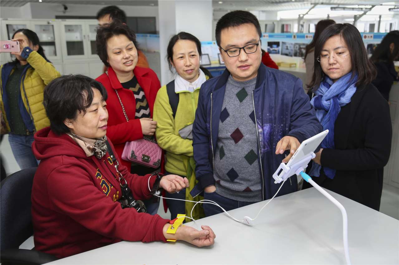 在上海智能制造研究院,大家参观了智能行走机器人、生机电仿生手、健康监控等最新科研成果,体验了“心狗”便携式心电血压测试仪,了解“互联网+医疗”国际领先技术产品,并向在研究院工作的50余名师生致以节日祝福,对他们环境优美、宽敞舒适的办公环境表示赞叹。