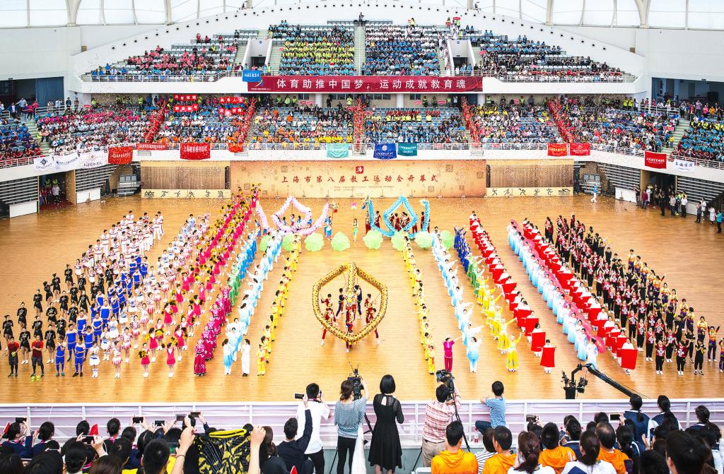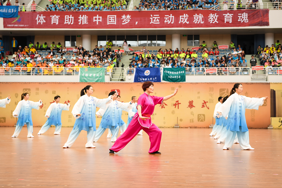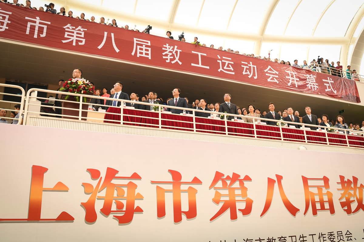 5月13日上午,上海市第八届教工运动会开幕式在上海交大霍英东体育中心举行。全国教科文卫体工会主席王科,市总工会主席莫负春,运动会组委会名誉主任、市教卫工作党委书记虞丽娟,市体育局副局长孙为民,市卫计委副书记郑锦,市教卫工作党委副书记成旦红,上海交大校长、校党委副书记、中国工程院院士林忠钦,上海市总工会秘书长宋钟蓓,运动会组委会副主任、市教委秘书长王从春,组委会常务副主任、市教卫工作党委巡视员王向群,运动会组委会副主任、上海交大党委常委、副校长张安胜,运动会组委会副主任、上海体育学院党委书记戴健,承办单位、协办单位代表,各高校、区教育局及直属单位近90支代表团团长、运动员、裁判员、志愿者出席开幕式。开幕式由市教委副主任李永智主持。