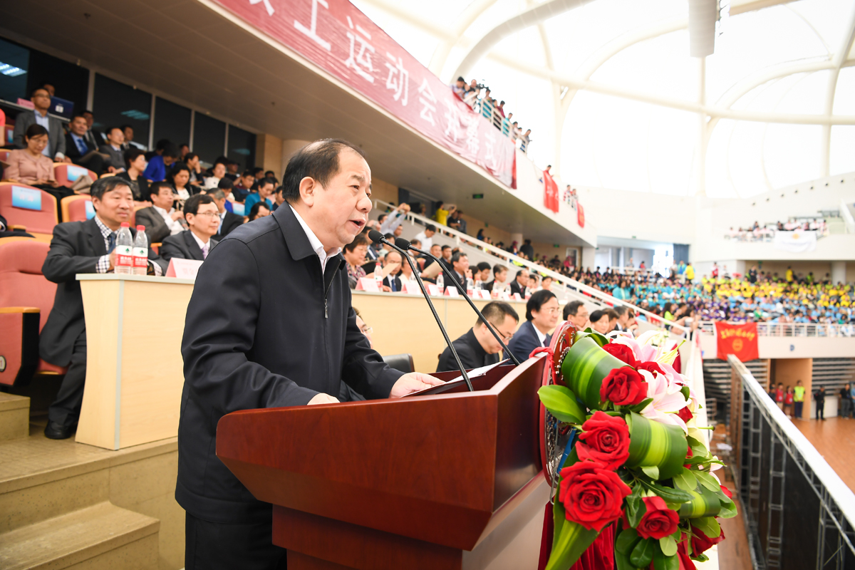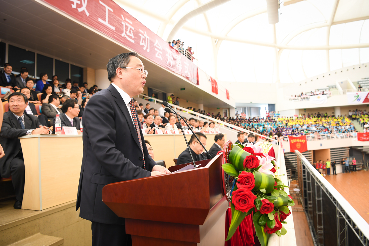 王科在致辞中表示,上海市历来重视职工体育运动的开展,特别是在上海市20多万教职工中开展的教工运动会,已经成为上海市一道靓丽的风景。教工运动会是上海市教育系统集竞技、娱乐为一体的一项传统活动,是全体教职工展现良好风貌、团结交流、弘扬向上精神的重要竞赛,也是繁荣校园文化、加强教职工思想教育、促进和谐校园建设的生动实践。希望教职工能够以此次运动会为契机,积极投身到全民健身、阳光体育运动中,快乐工作、健康生活,在自己的岗位上建功立业,为上海市教育事业开创新局面。