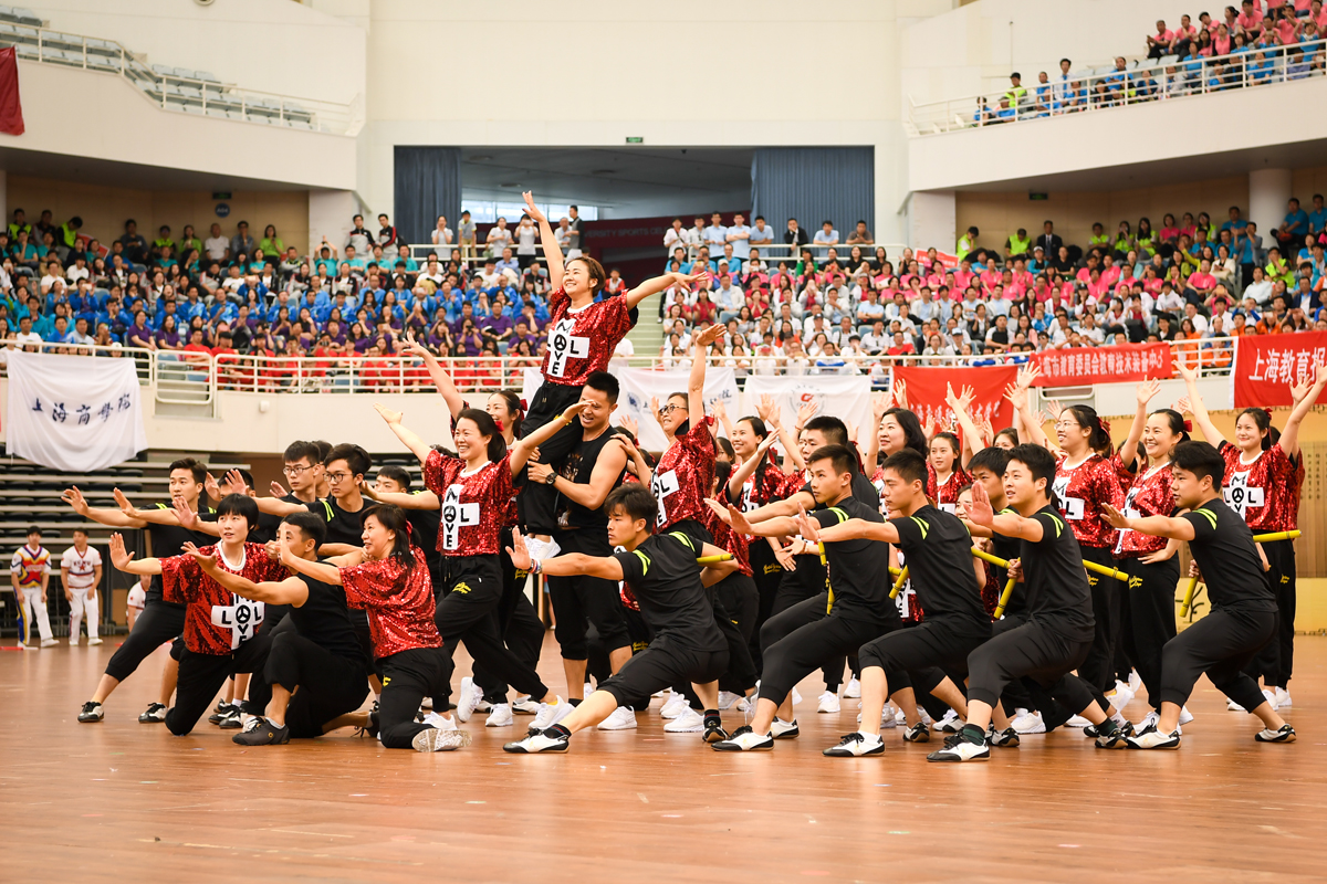 在接下来的群众体育活动展示和体育项目表演环节,由88家基层单位880位教职员工组成的第九套广播体操方阵和戏曲韵律操展示团队队形整齐划一、动作舒展干练、服饰绚丽多彩、队员神采飞扬,充分展示了教育系统各基层单位在开展群众性体育活动中的成果;来自13所高校、区教育局的表演团队演绎了舞龙、武术、抖空竹、健美操、花式跳绳、腰鼓等节目,令人目不暇接,赢得了现场近5000名观众的热烈掌声与喝彩。