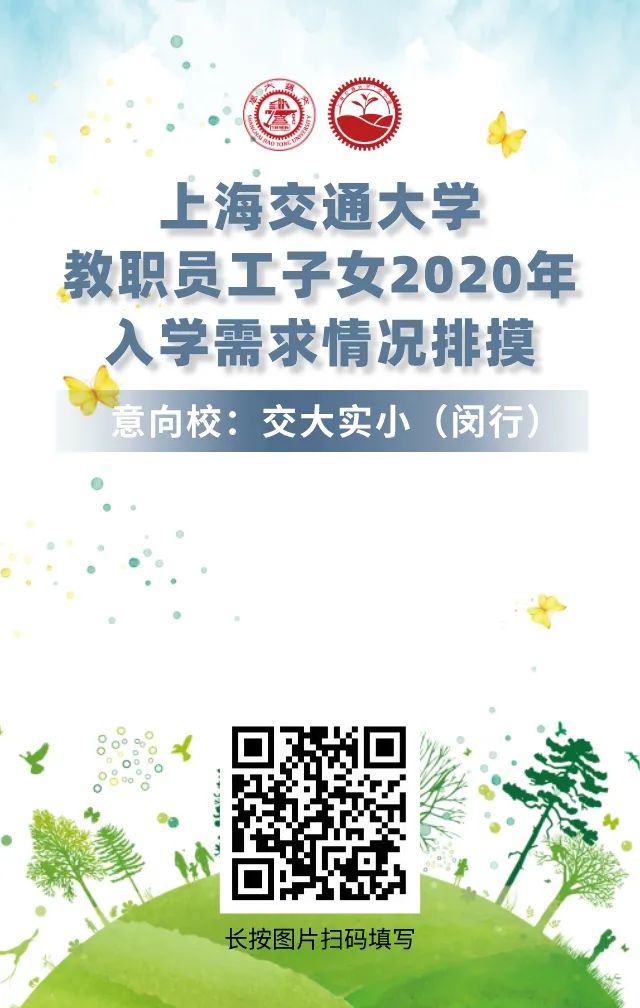 近日,上海市及各区相继发布2020年义务教育阶段学校招生入学工作的实施意见。为协调做好我校教职员工子女入学及附属学校招生工作,上海交通大学加强区校共建基础教育领导小组办公室现启动教职员工子女2020年9月入学意向情况的排摸工作。