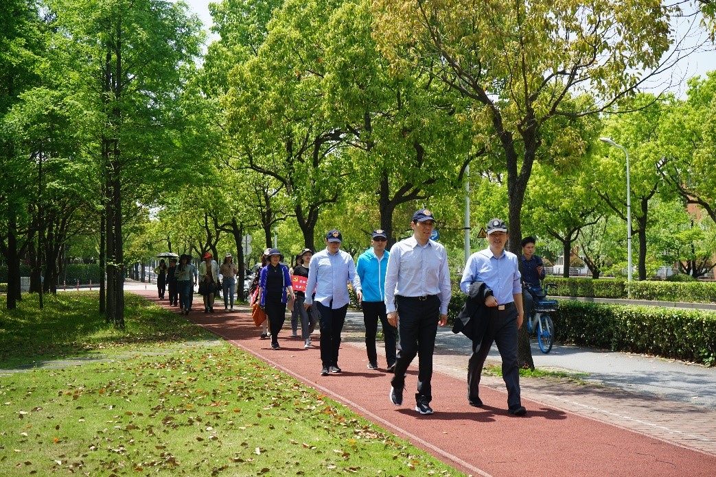 活动开始,大家按照前期规划的“健步走路线图”迈步走入春光明媚的校园。本次健步走从宣怀大道及龙坡路路口出发,环绕包玉刚健步道,途经叔同路、思源南路、思源东路、文治大道、南洋北路等。健步走是一项以促进身心健康为目的,协调姿势、速度和时间的有氧步行运动,在良好的自然环境中结伴健步走,不仅锻炼了身体,还能欣赏校园春景,促进相互交流,陶冶身心。